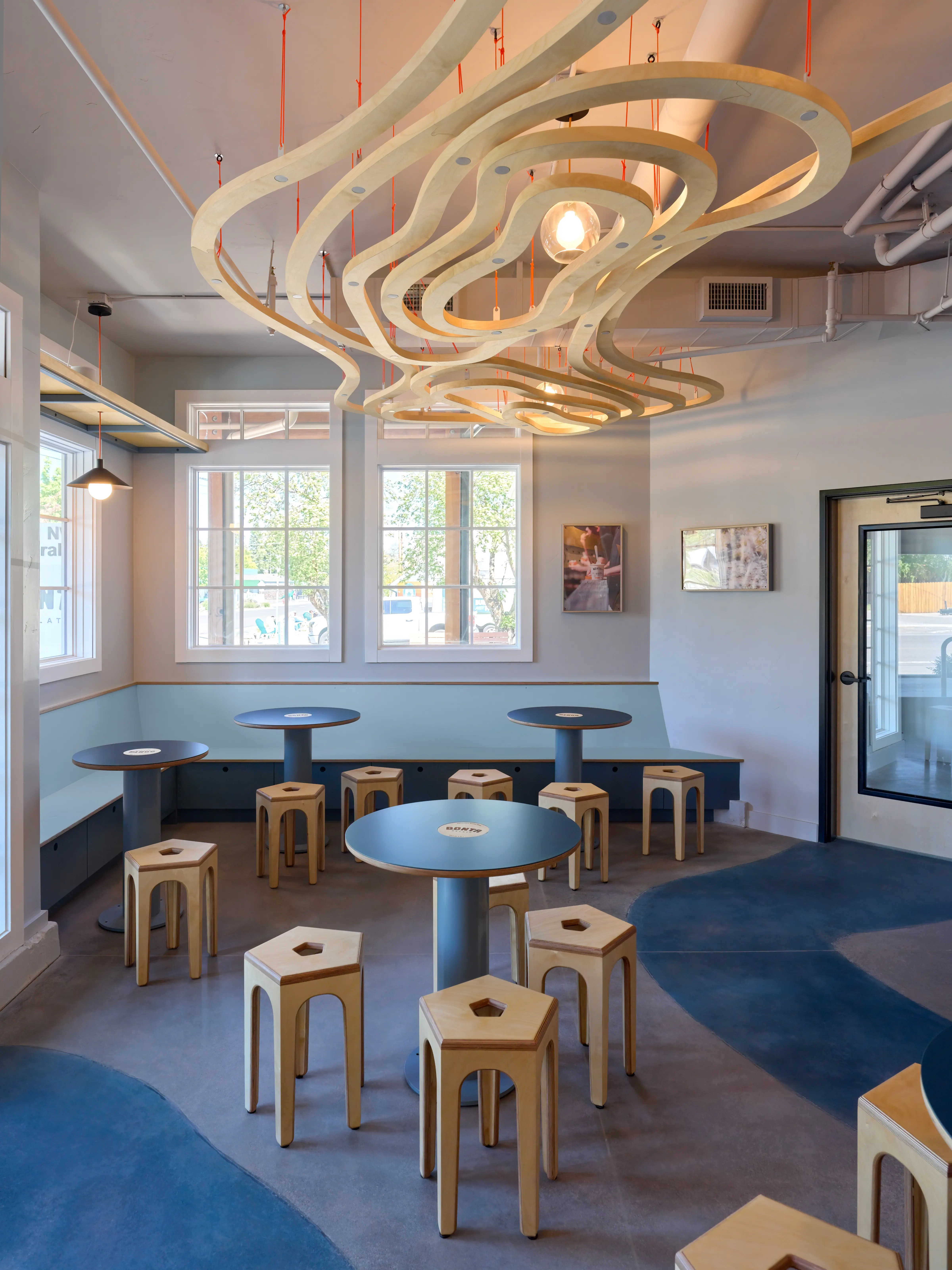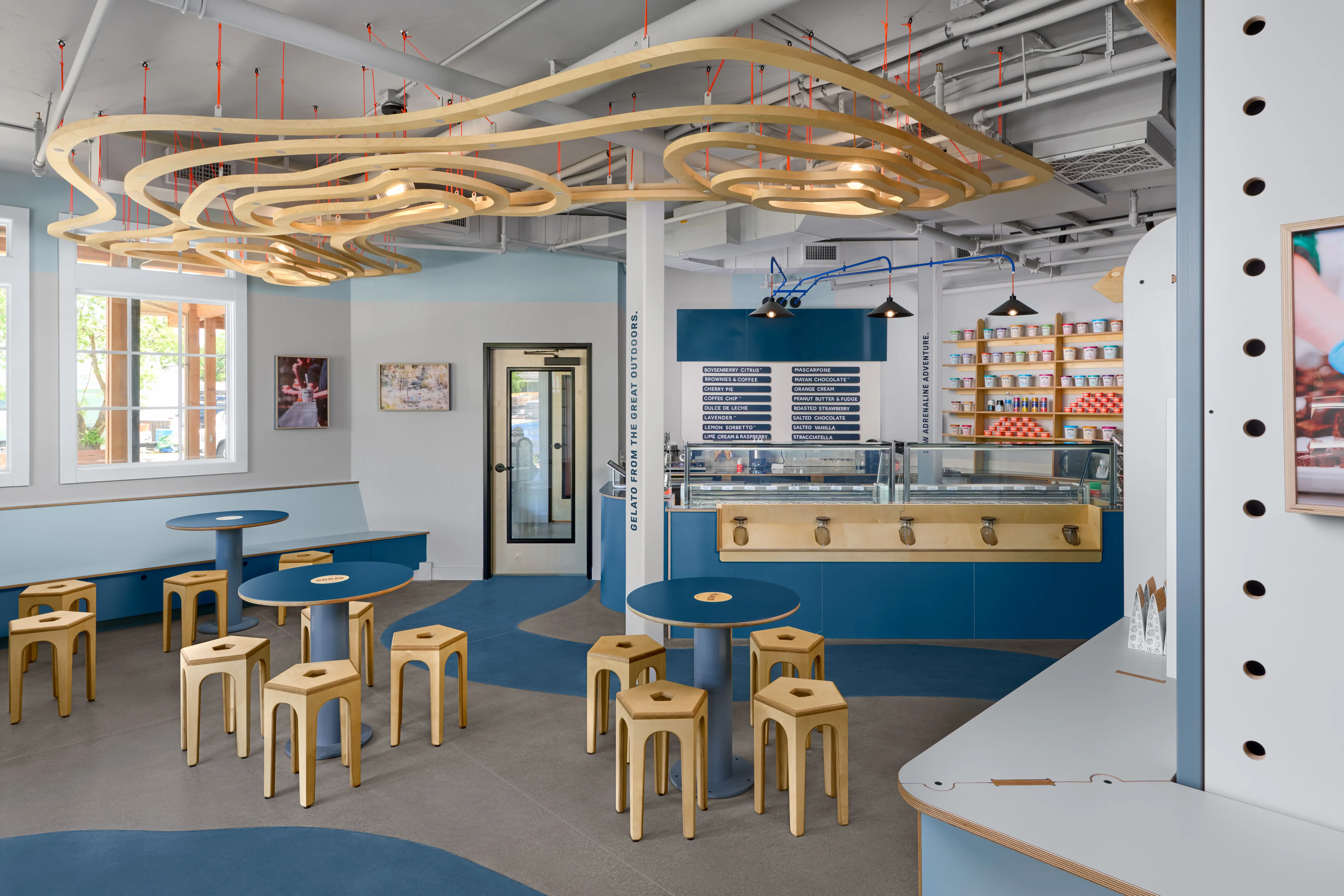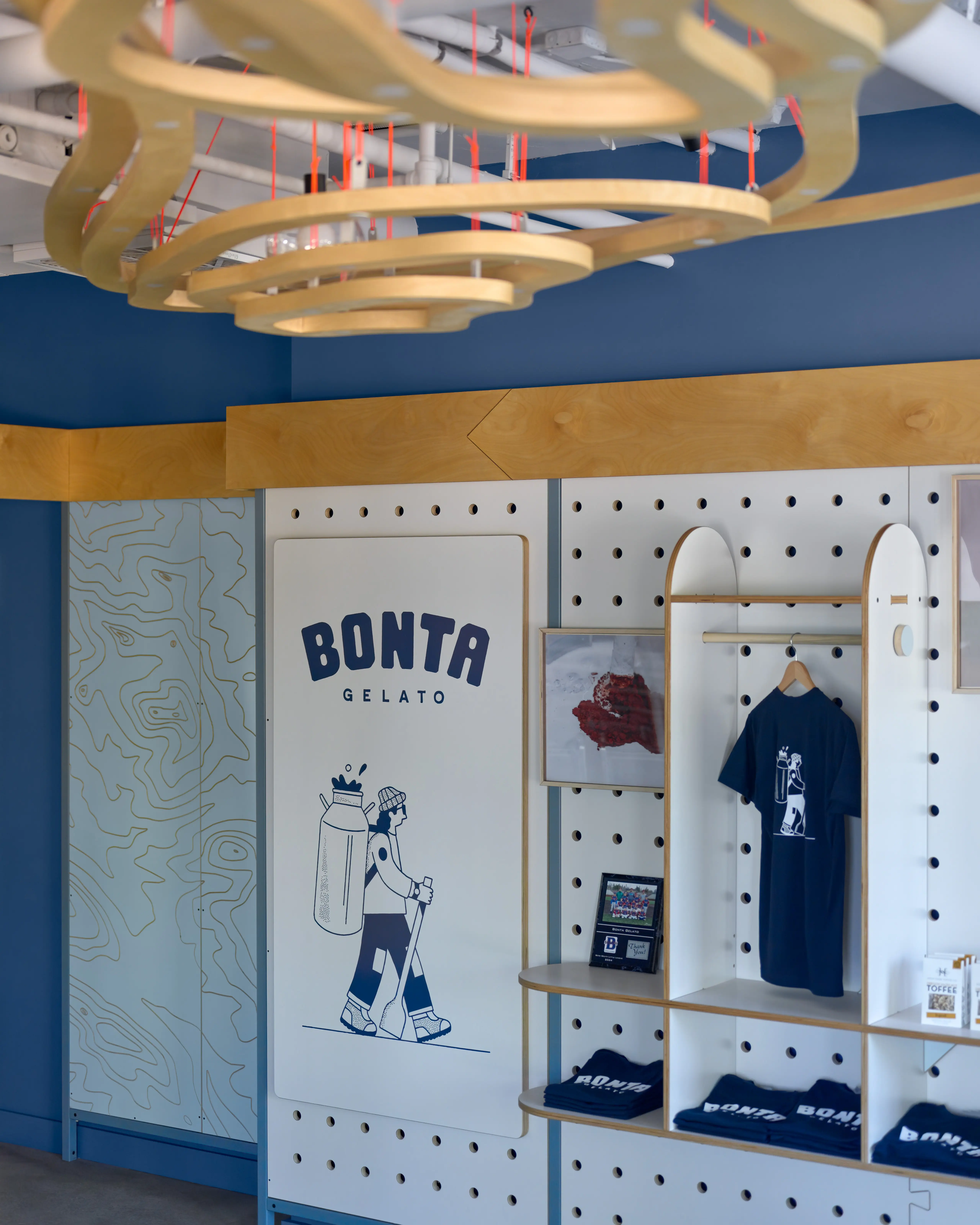 In collaboration with Ben Hull of Connell Hull Company, Blue Forty fabricated a wooden topography sculpture, furniture, a steel partition wall, a toppings display, and product shelving, every piece built for this space and designed to adapt to the next one.