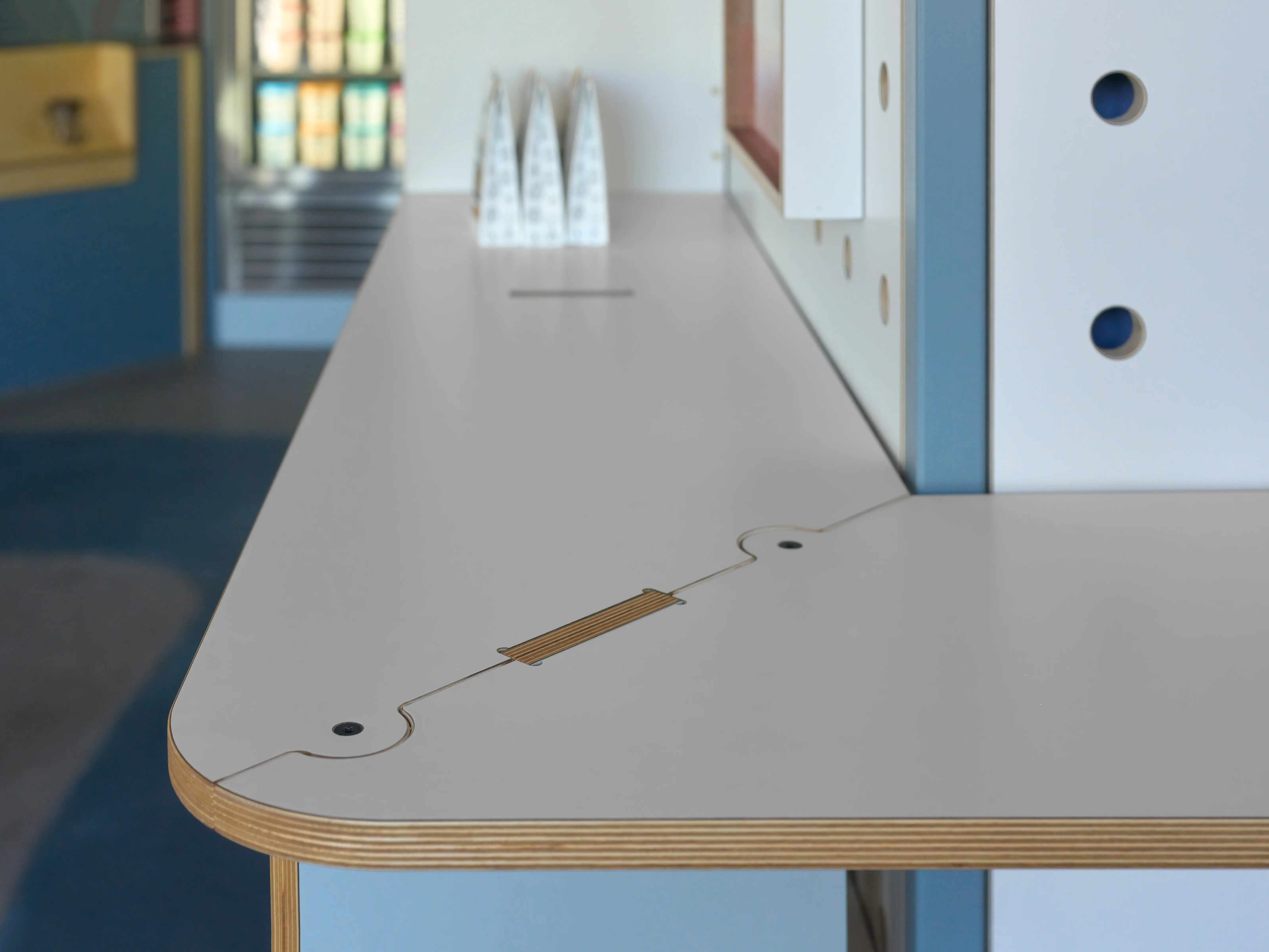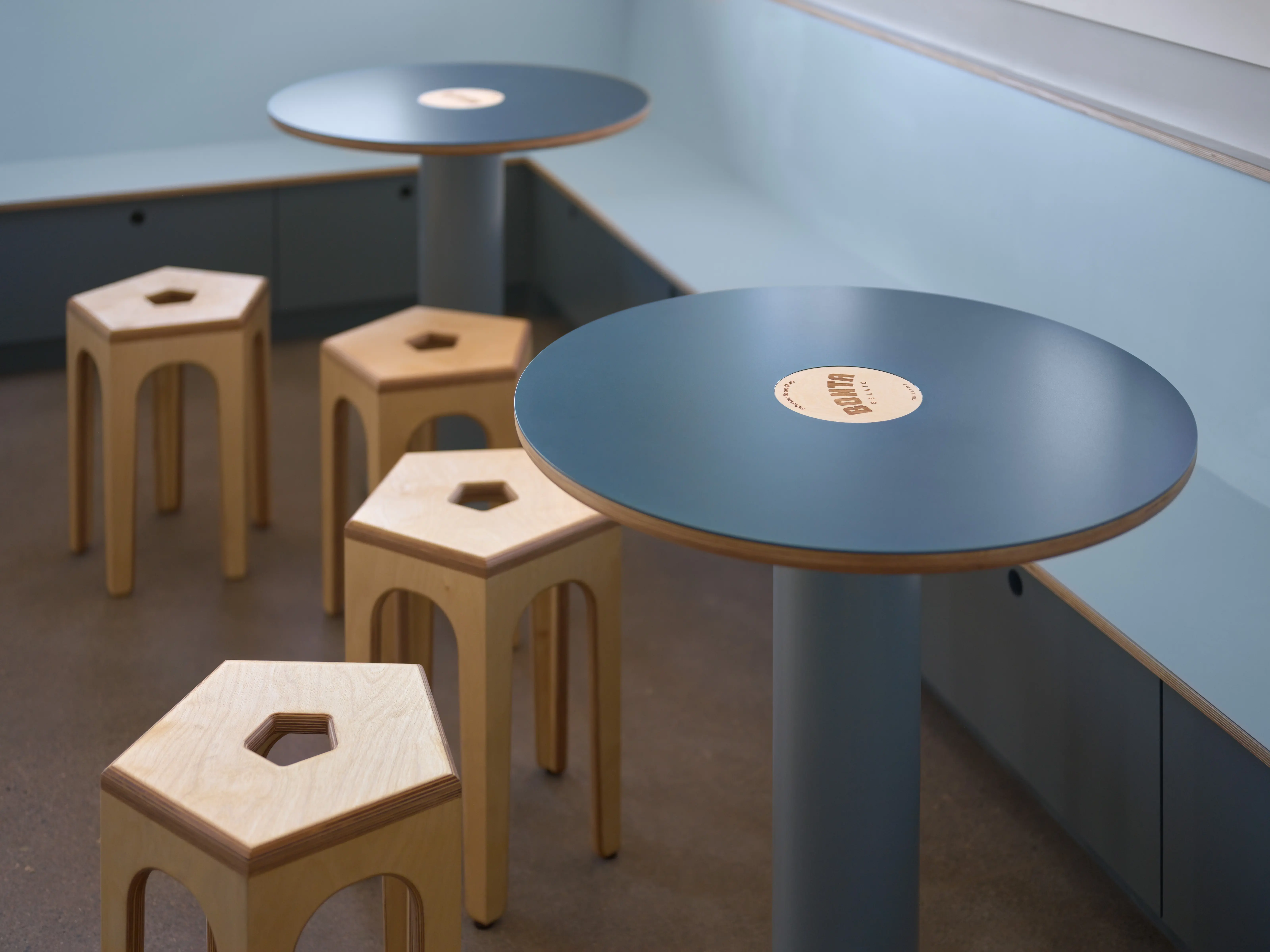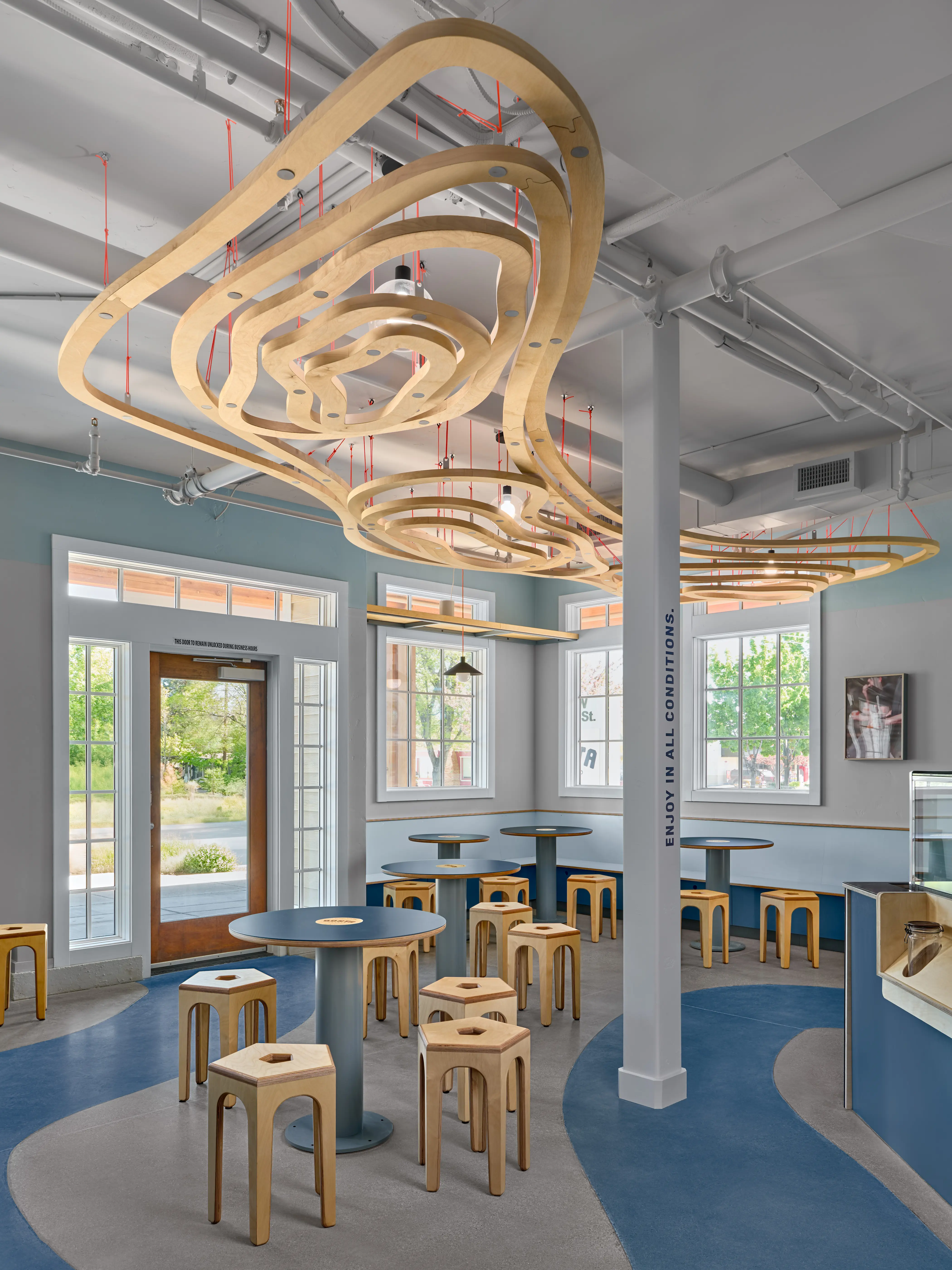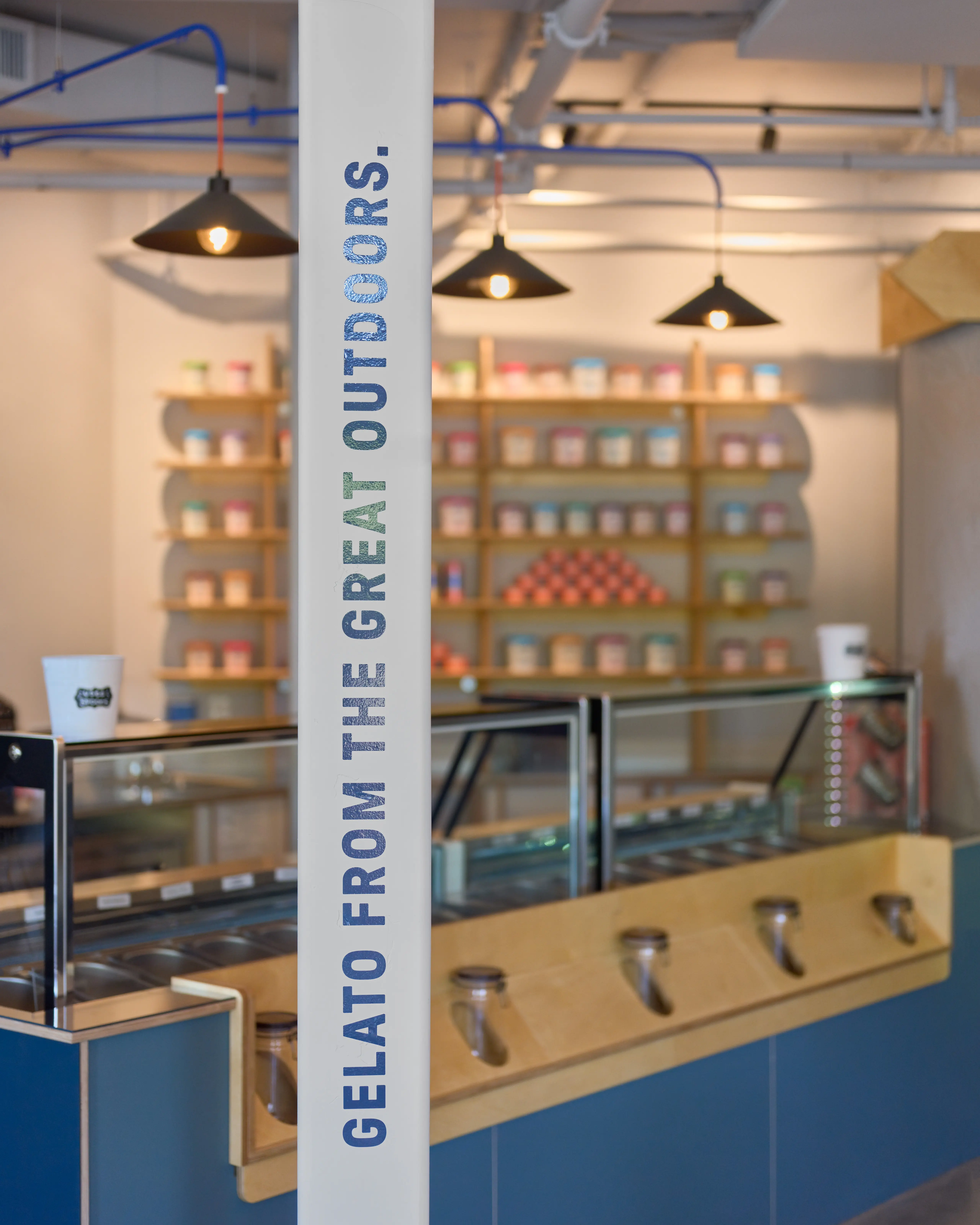 In collaboration with Ben Hull of Connell Hull Company, Blue Forty fabricated a wooden topography sculpture, furniture, a steel partition wall, a toppings display, and product shelving, every piece built for this space and designed to adapt to the next one.