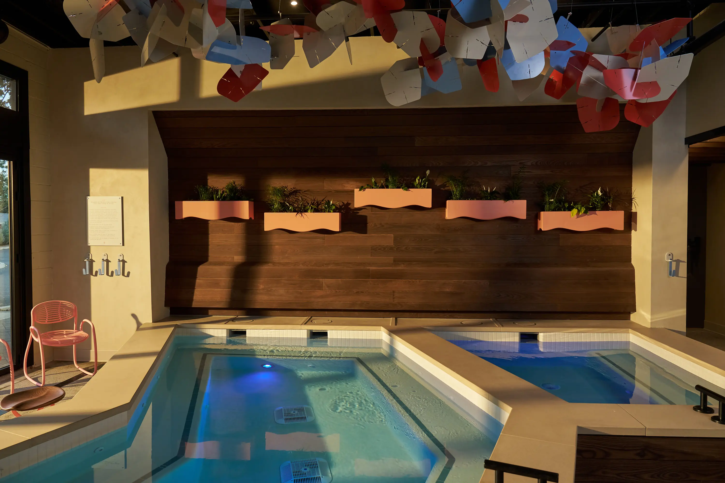 Natural materials run throughout: wood, stone, warm finishes that hold their own against the humidity and activity of a working thermal lounge. Every collaborator on the build team — Roost Development, Rimor Aquatics, FR33FORM Furniture, Connell Hull Company, WallsArt — was brought in because they could meet the project at that level. The result is a space that feels considered at every scale, from the pool edge to plaster walls to the have-to-see-it suspended art installation.