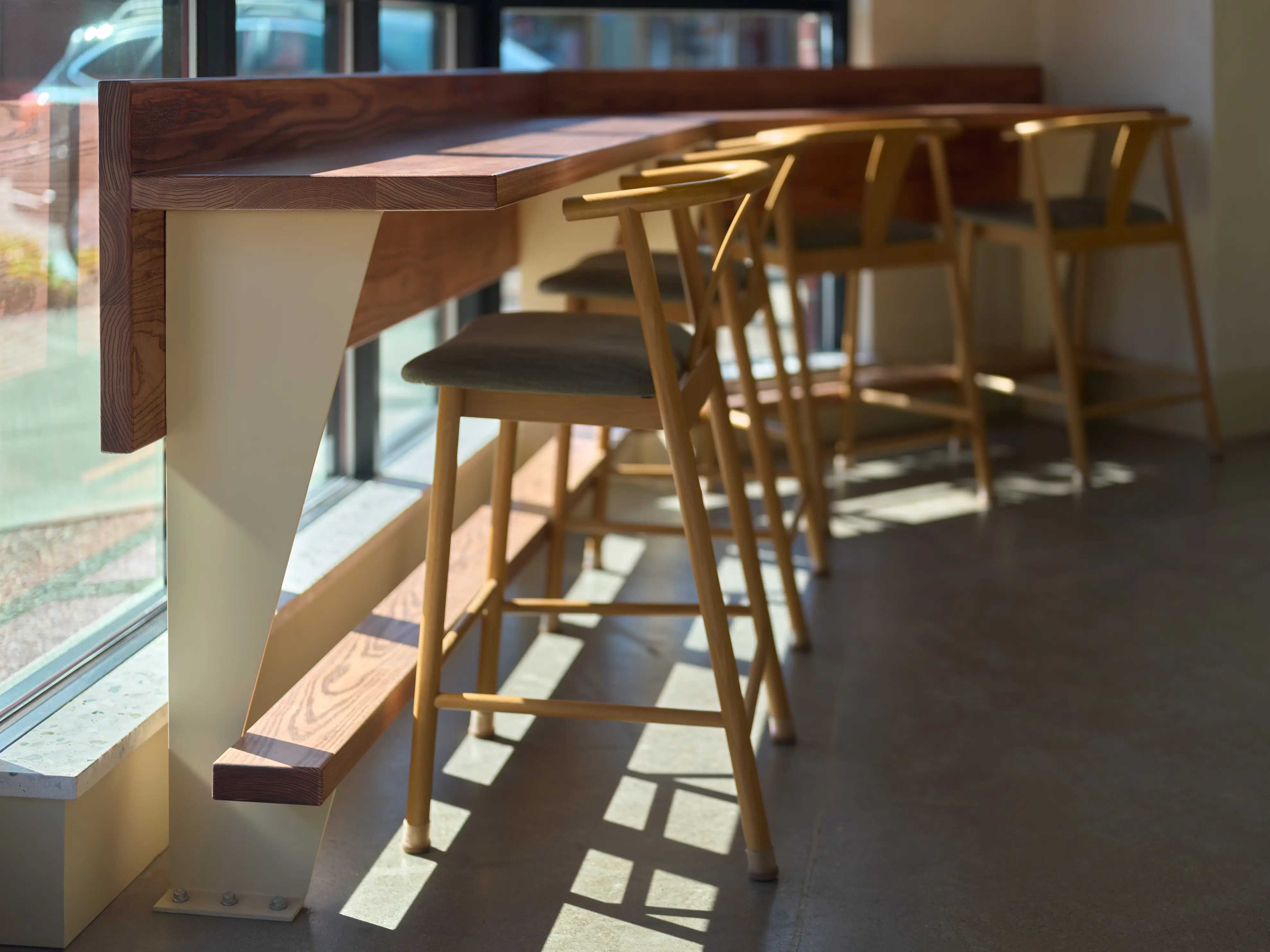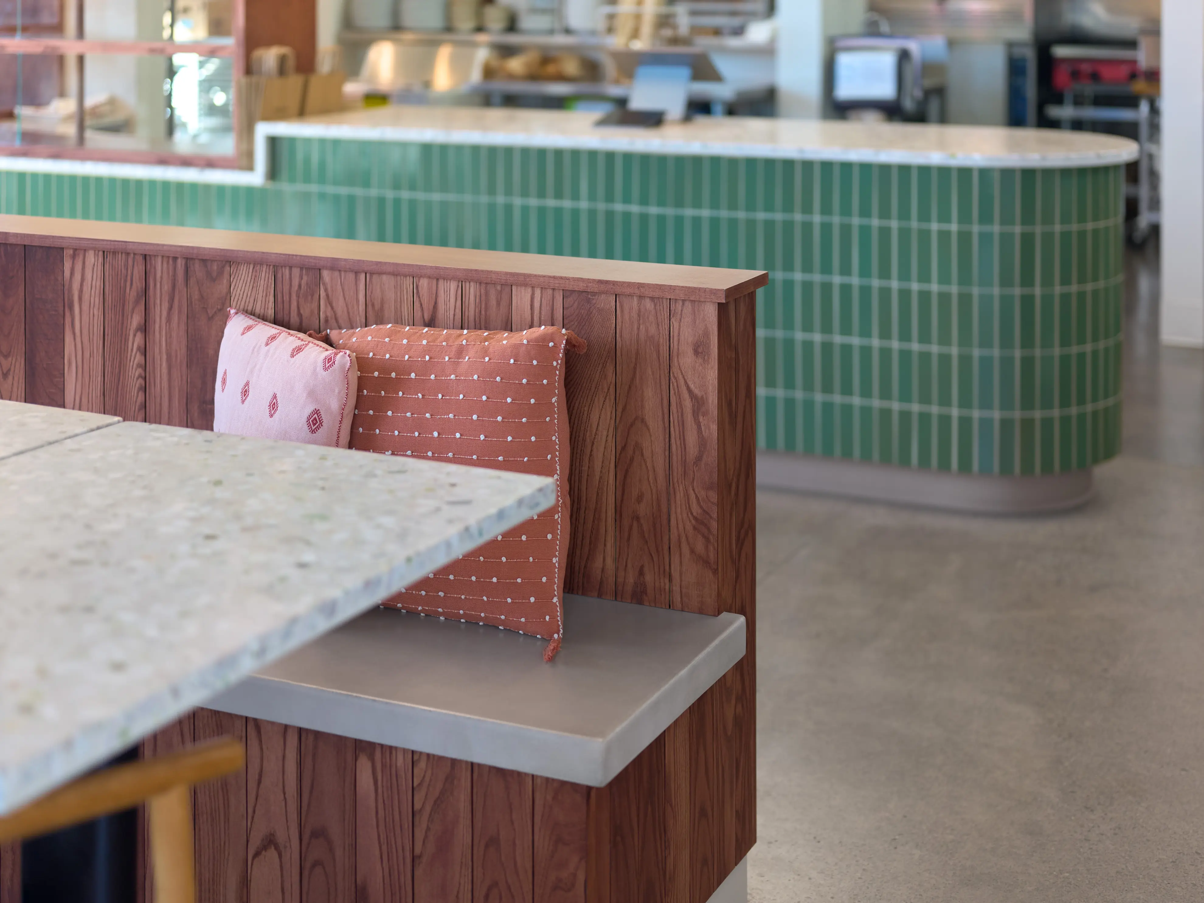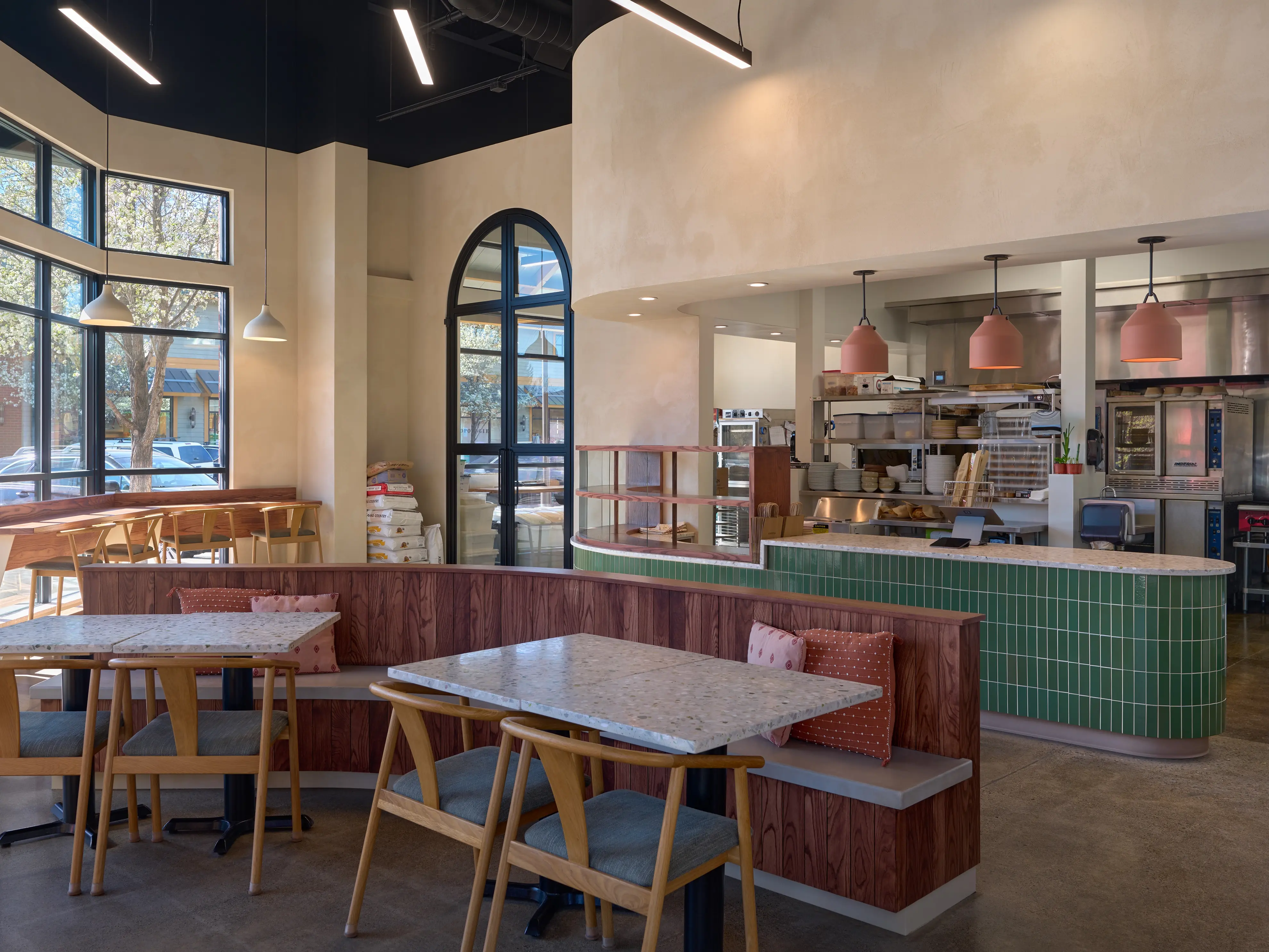The floor plan is built around function as much as atmosphere. The space serves double duty as storefront and production kitchen, with layout decisions made to support both. At the entry, a curved funnel manages the crowds M's regulars know well; it's crowd control that doesn't look like crowd control.