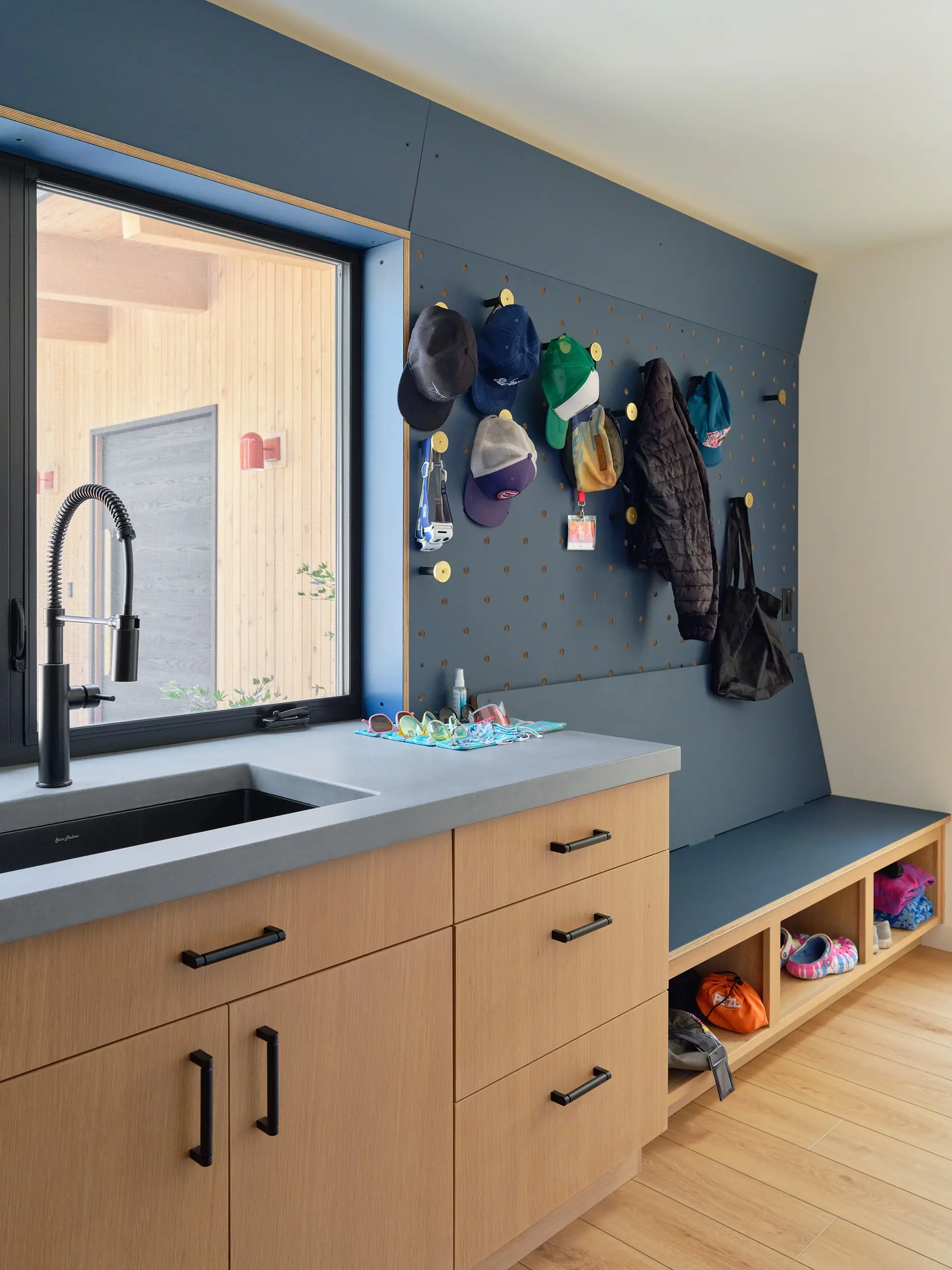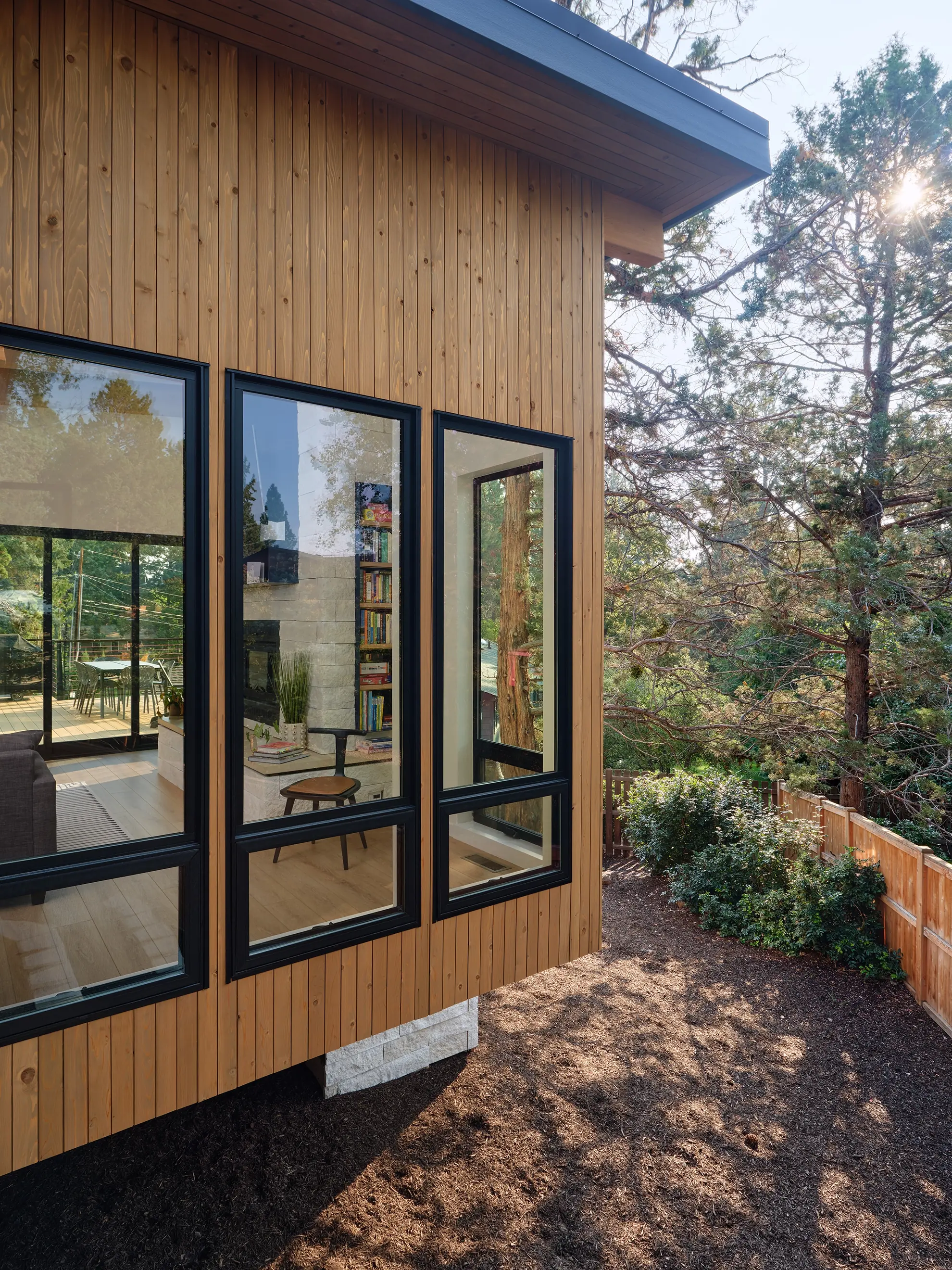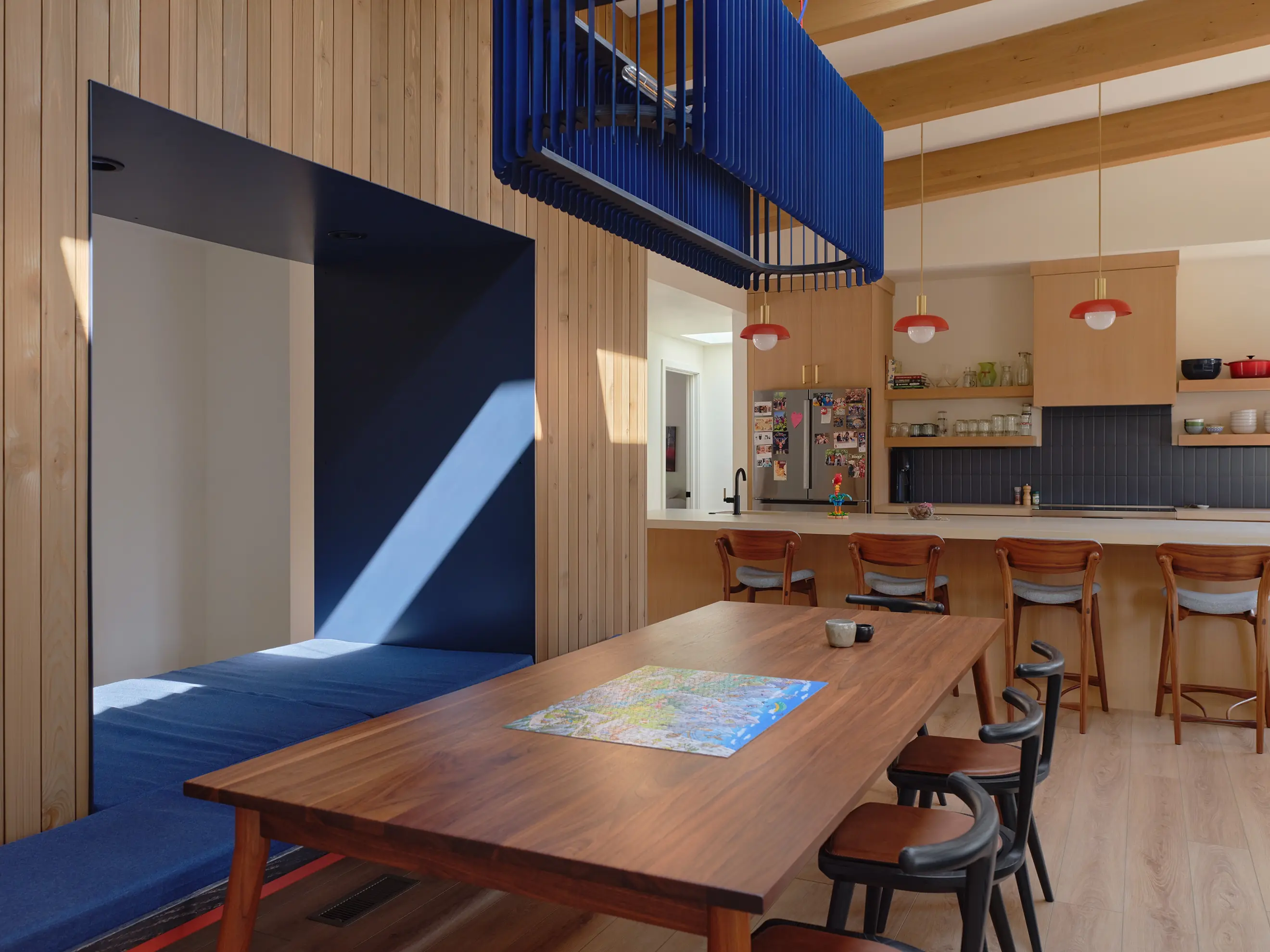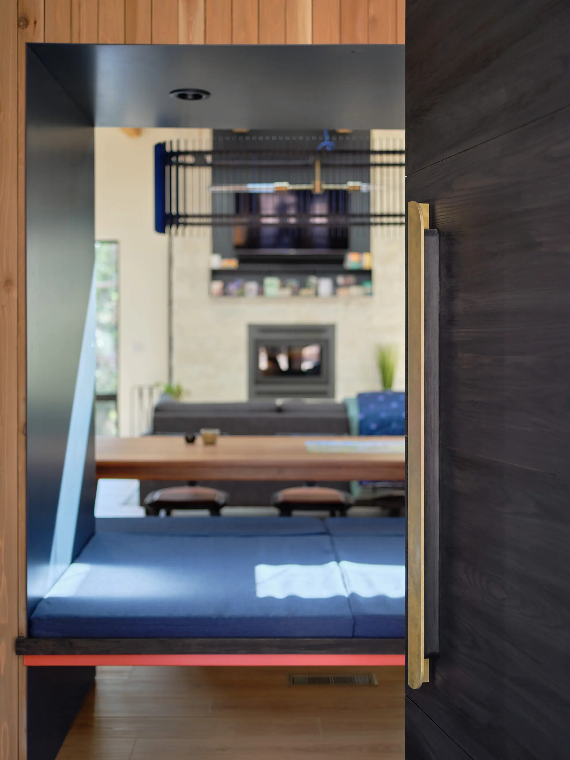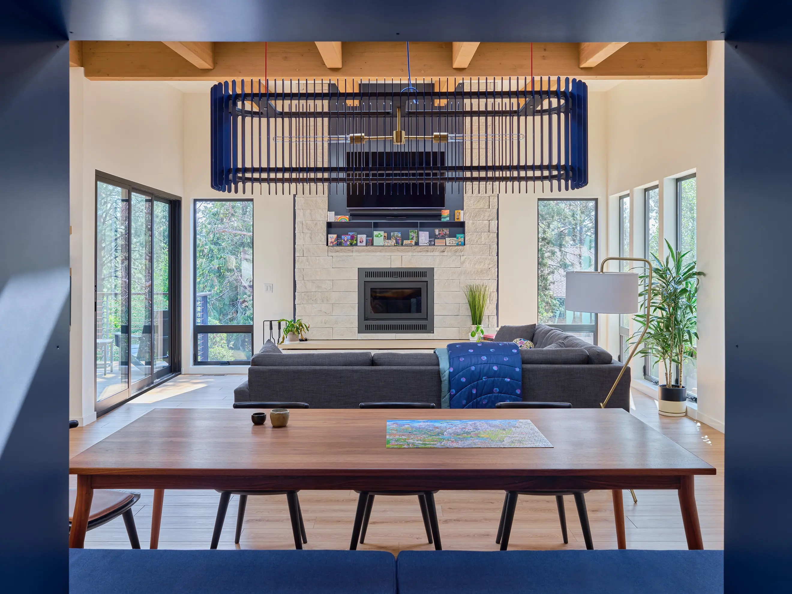 Windows create privacy and views simultaneously, with generous daylight on a tight lot. Custom fabrication runs throughout: entry bench, deck railing, fireplace mantle and wood storage, dining fixture, a modular gear wall in the mud room. The pivot door is five feet of thermally modified ash, built by Matthew Sellens, and the home features furniture by Justin Nelson of Fernweh Woodworking.