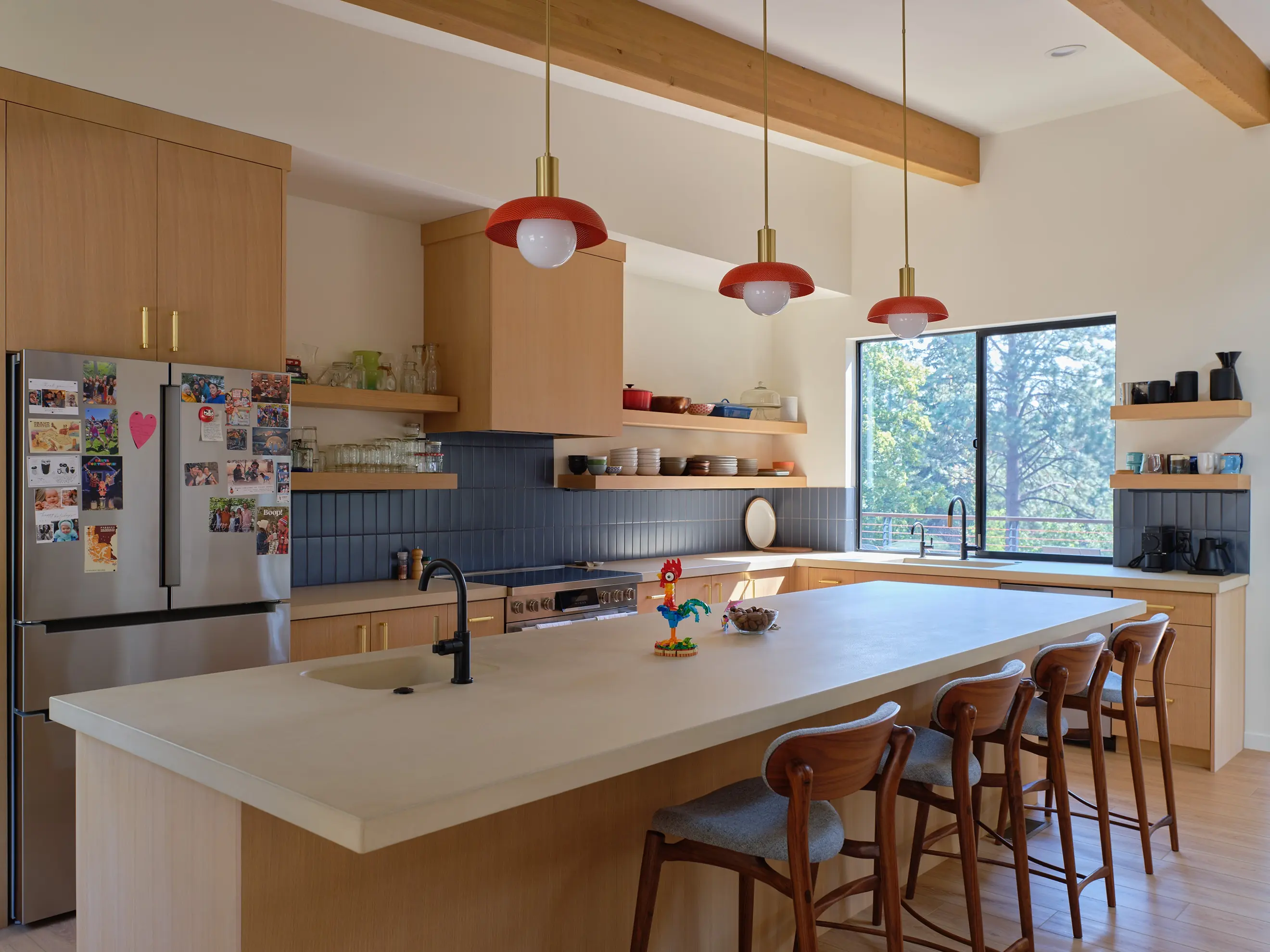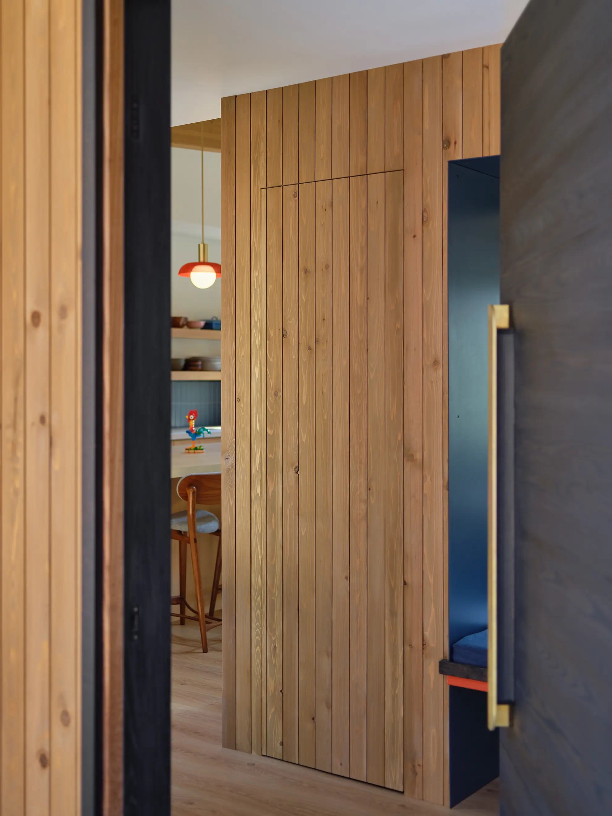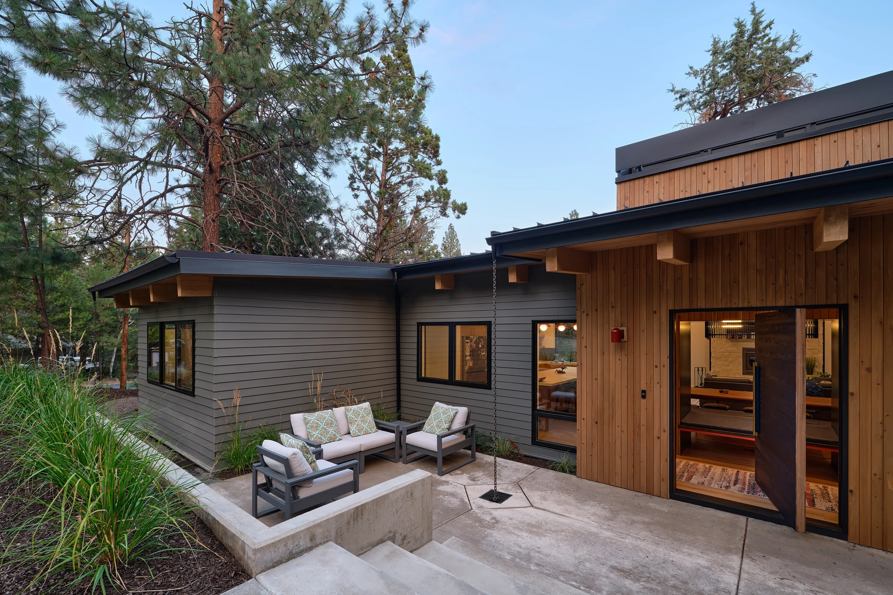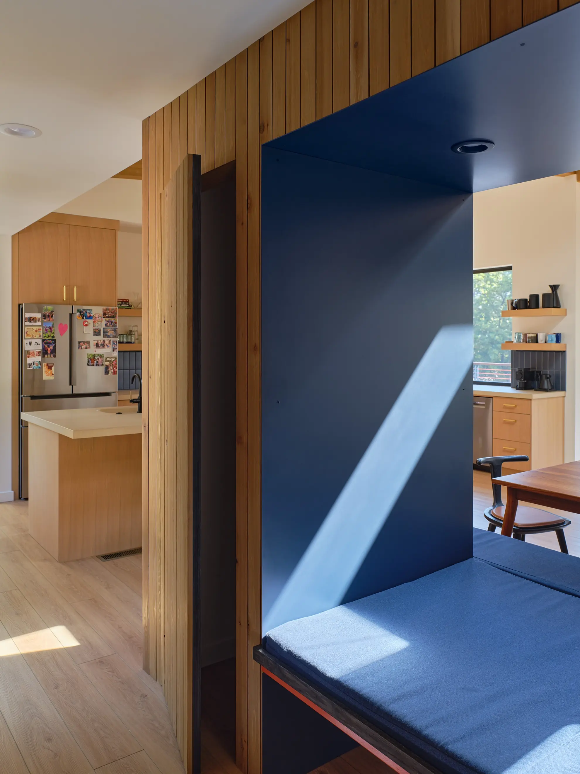 Windows create privacy and views simultaneously, with generous daylight on a tight lot. Custom fabrication runs throughout: entry bench, deck railing, fireplace mantle and wood storage, dining fixture, a modular gear wall in the mud room. The pivot door is five feet of thermally modified ash, built by Matthew Sellens, and the home features furniture by Justin Nelson of Fernweh Woodworking.