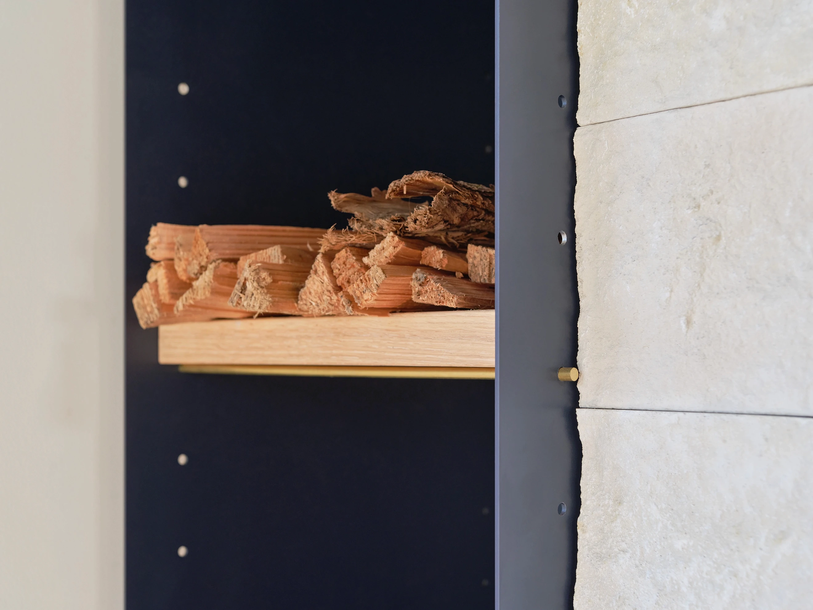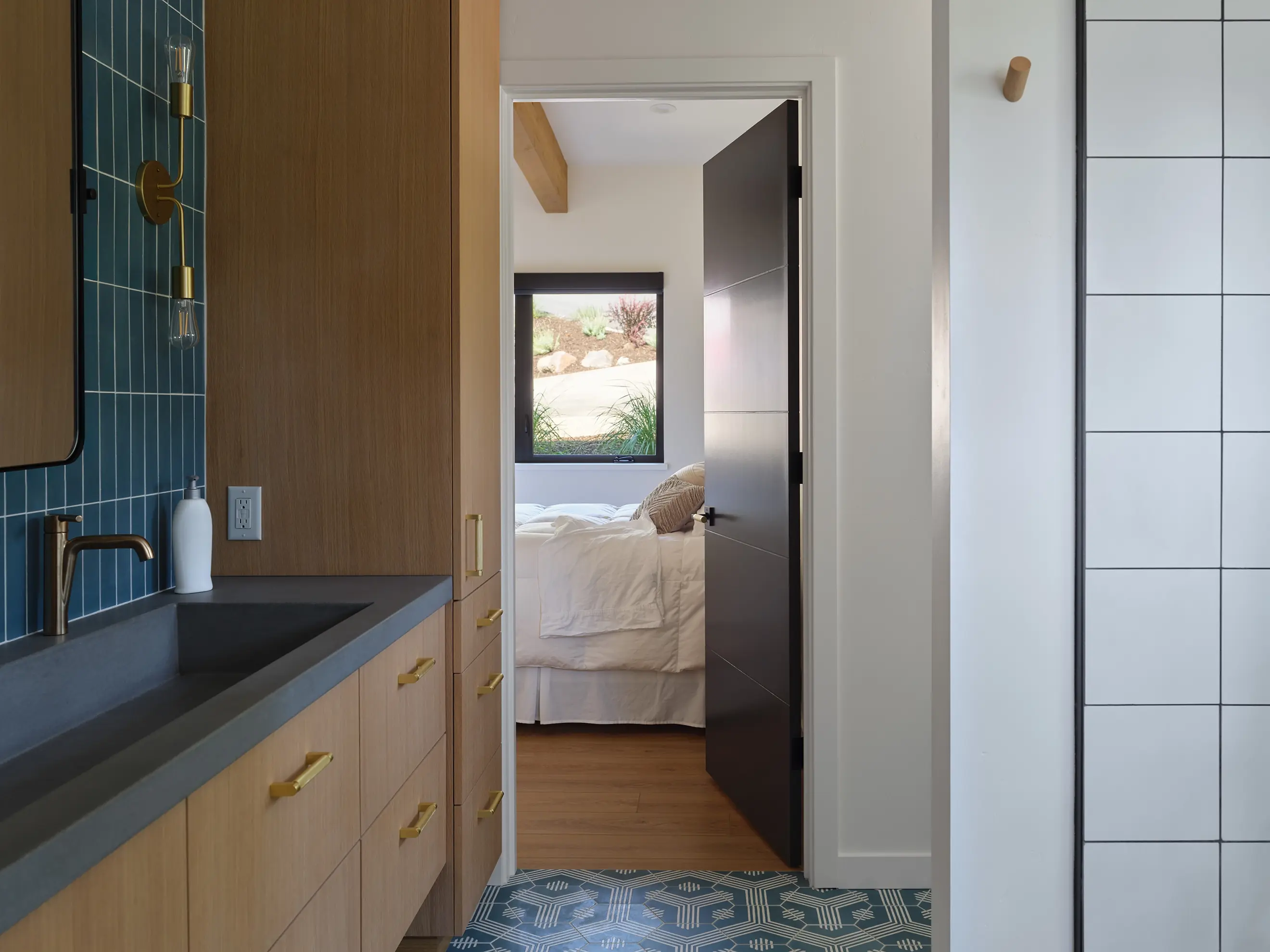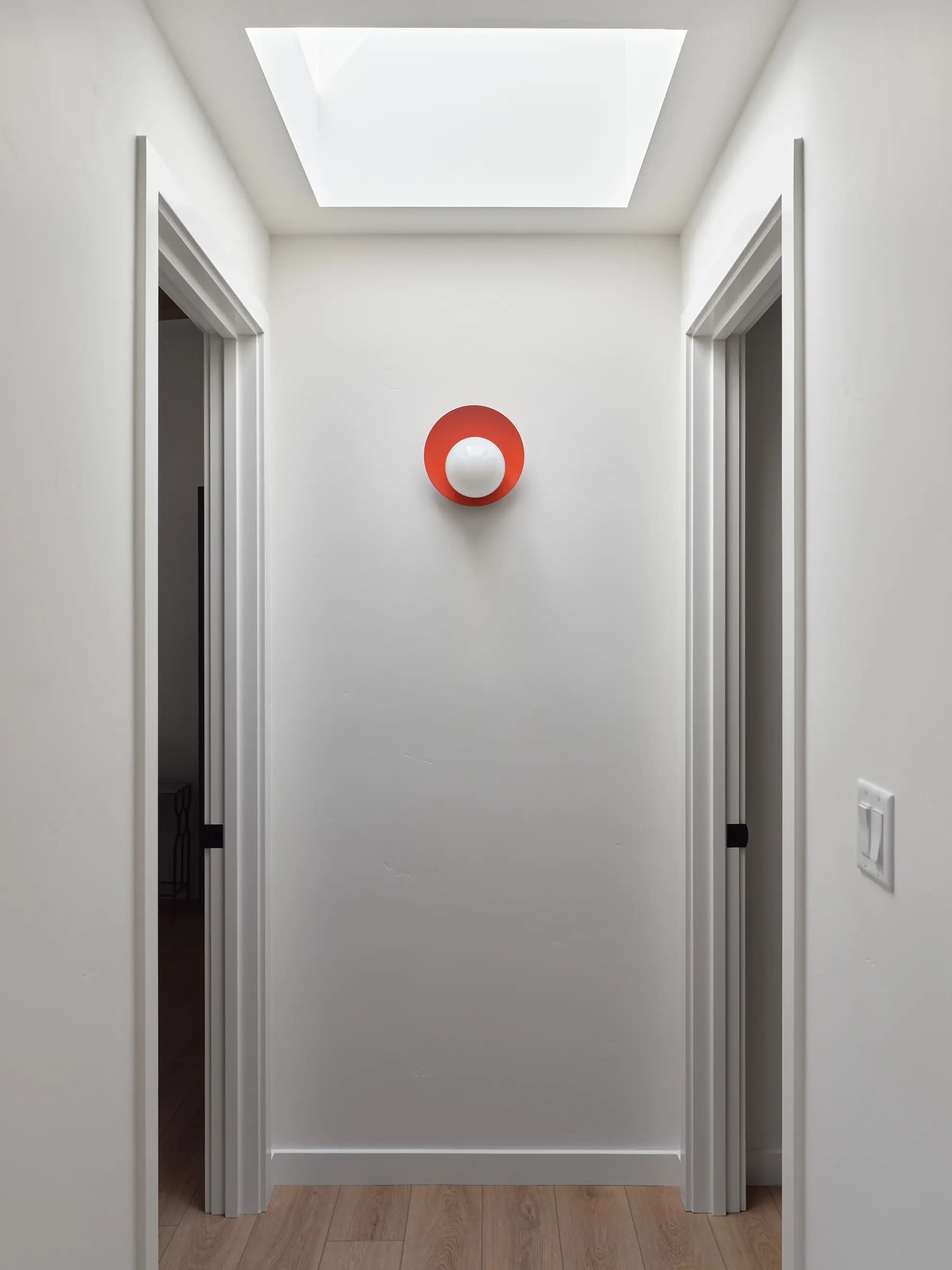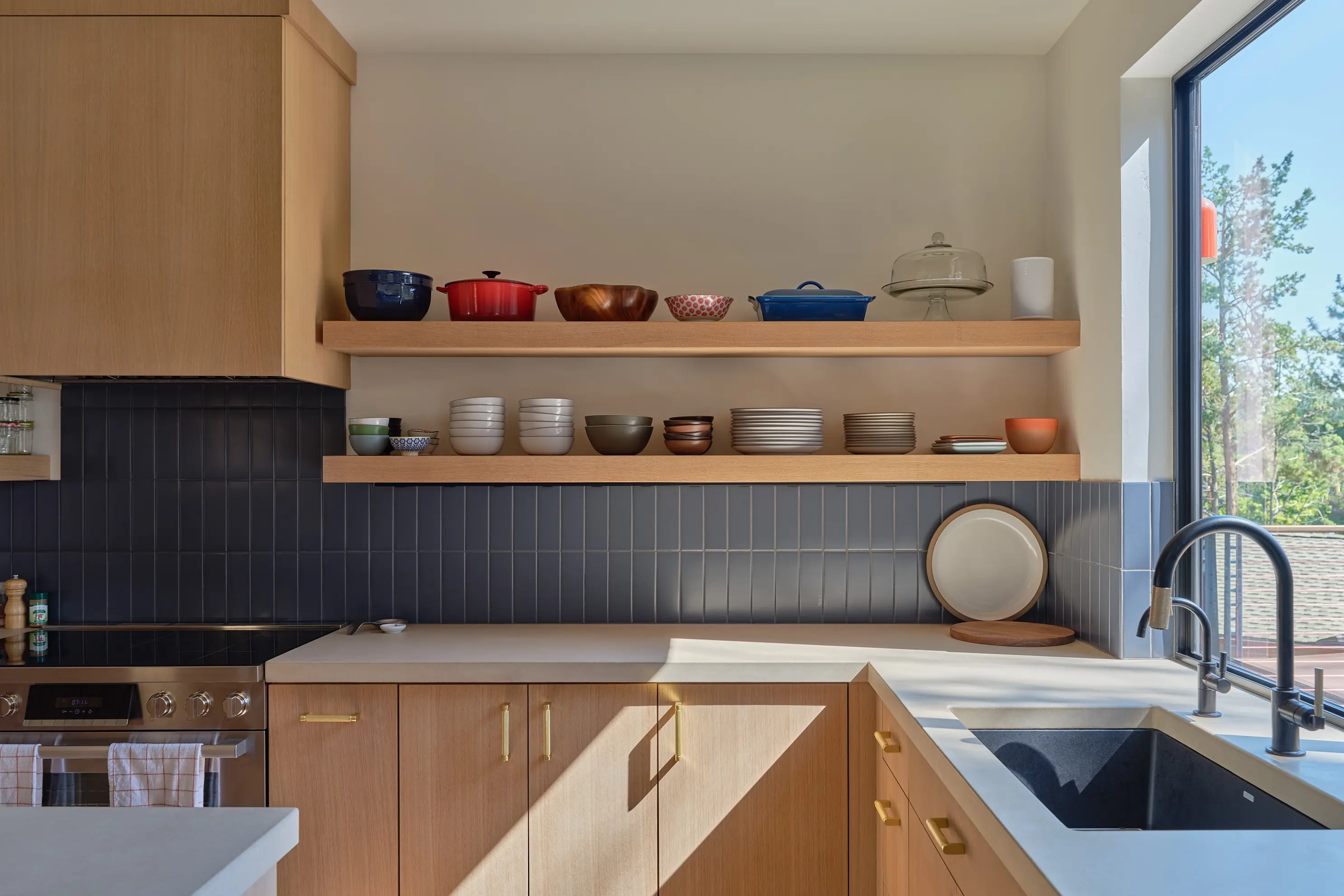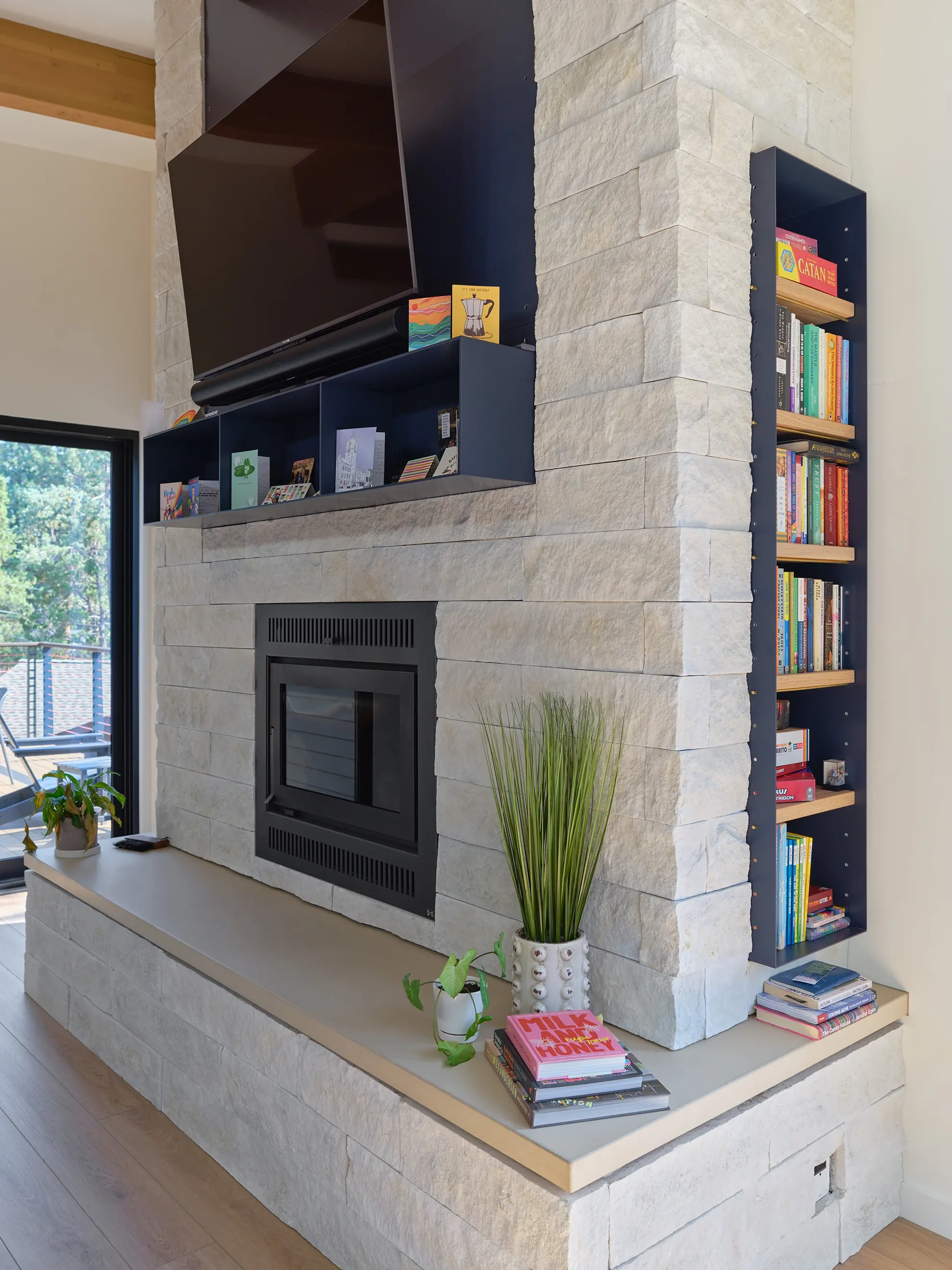 Windows create privacy and views simultaneously, with generous daylight on a tight lot. Custom fabrication runs throughout: entry bench, deck railing, fireplace mantle and wood storage, dining fixture, a modular gear wall in the mud room. The pivot door is five feet of thermally modified ash, built by Matthew Sellens, and the home features furniture by Justin Nelson of Fernweh Woodworking.
