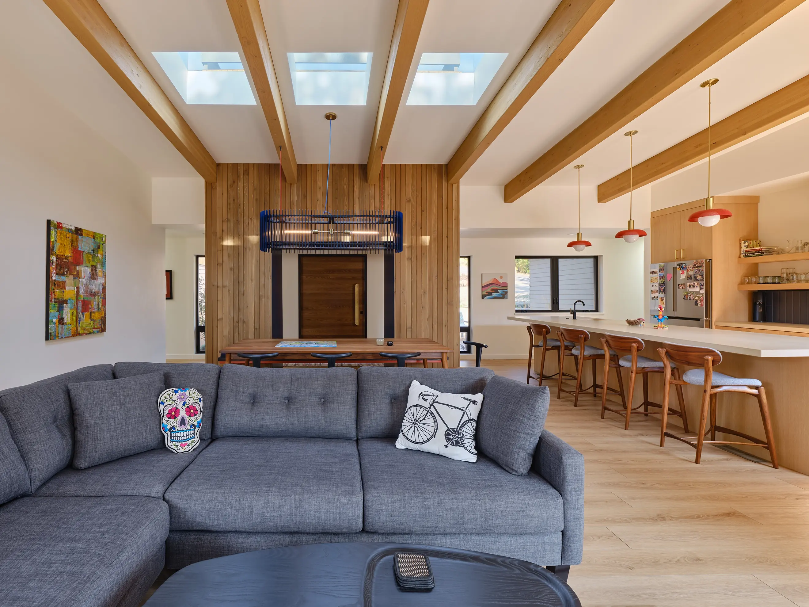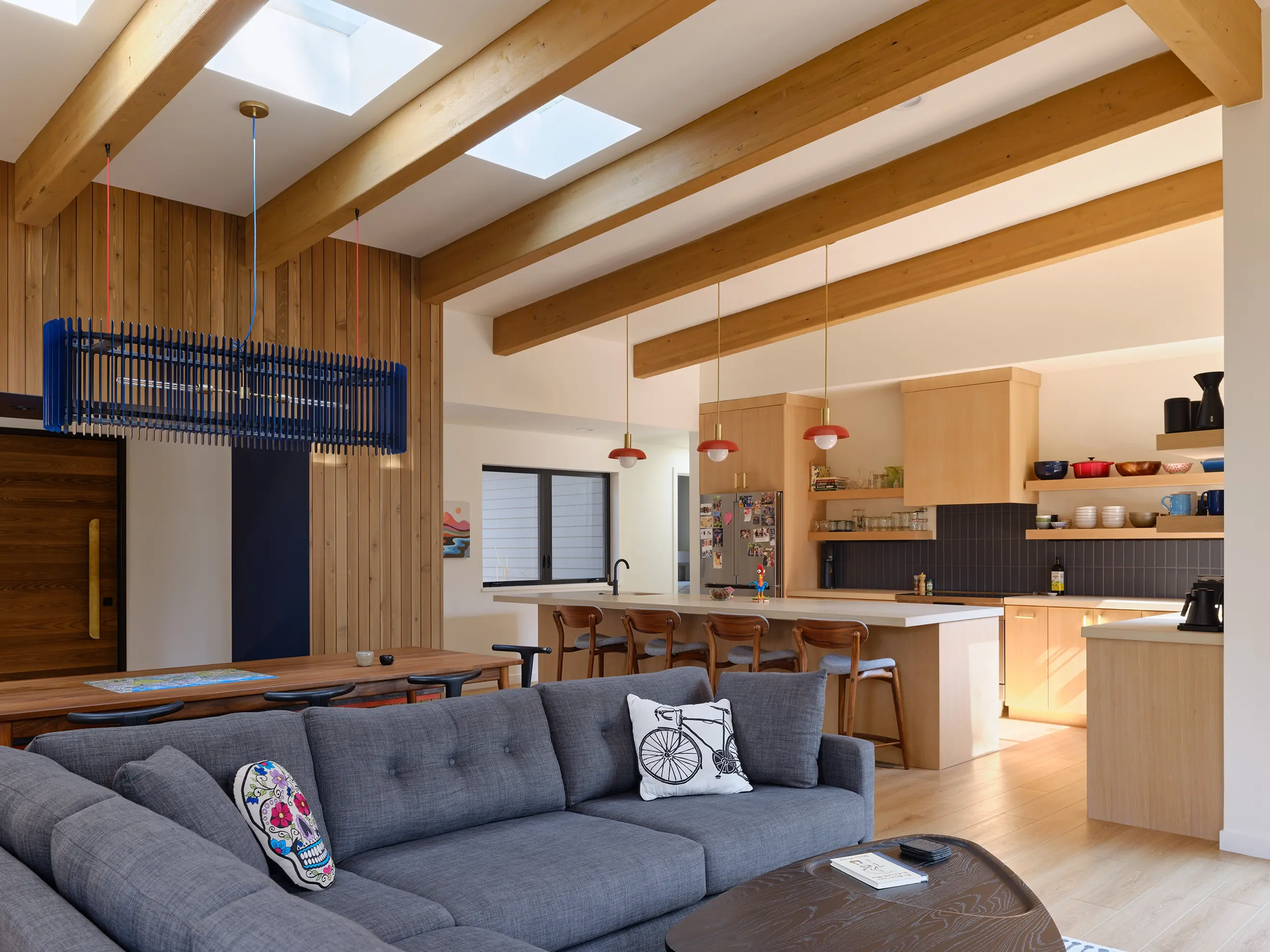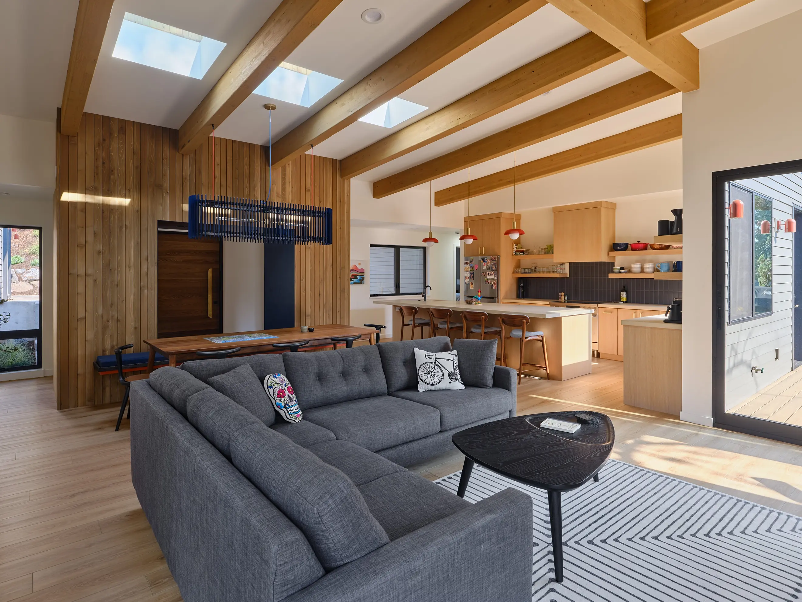 Glulam beams spaced to a four-foot module organize the structure and the plan. The living room cantilevers to the fireplace. The garage sits above the house. The roof, visible from the road, becomes a fifth elevation, all penetrations folded into a single chimney shroud so it reads clean from every angle. Two thousand square feet. Nothing wasted.