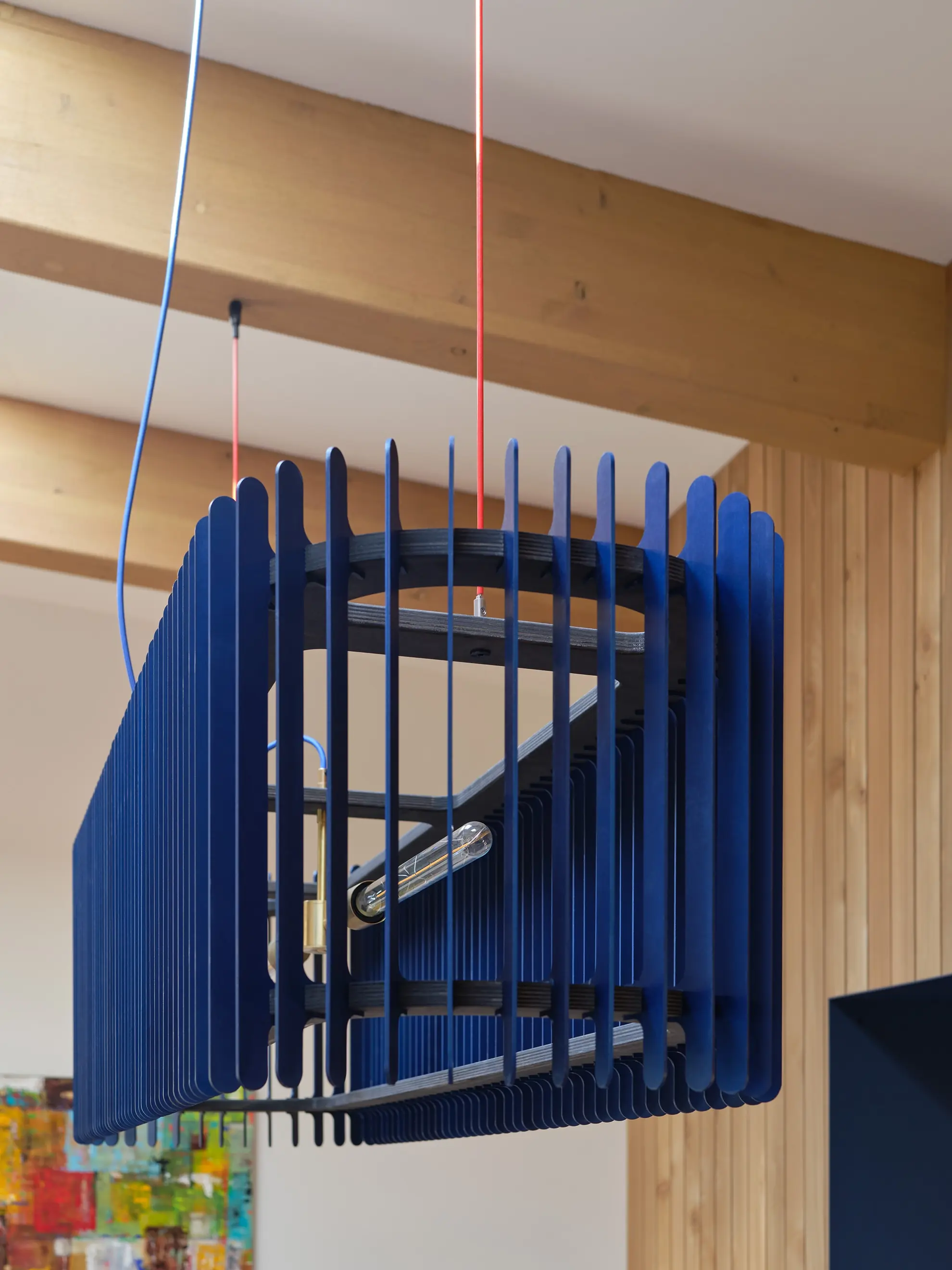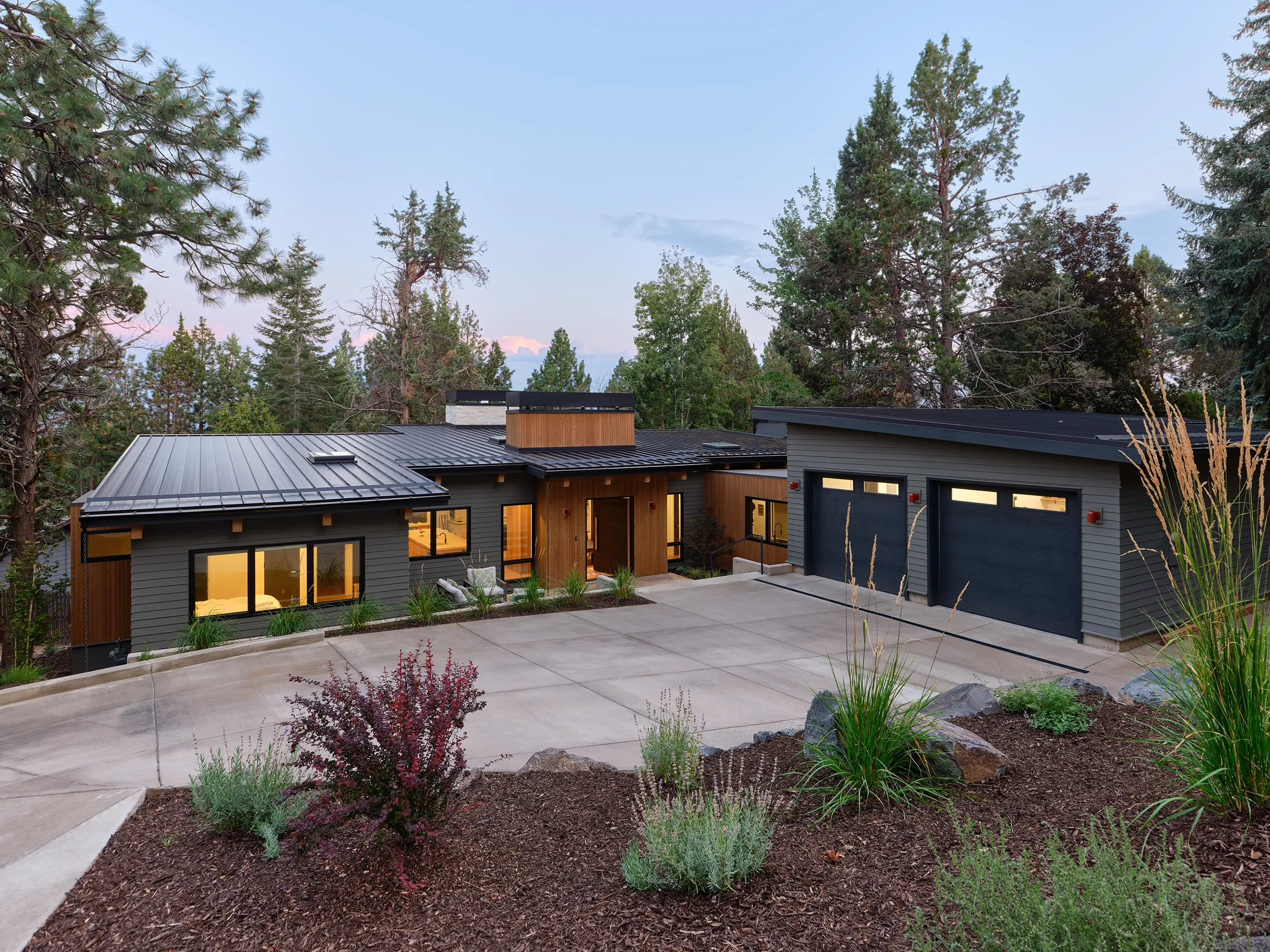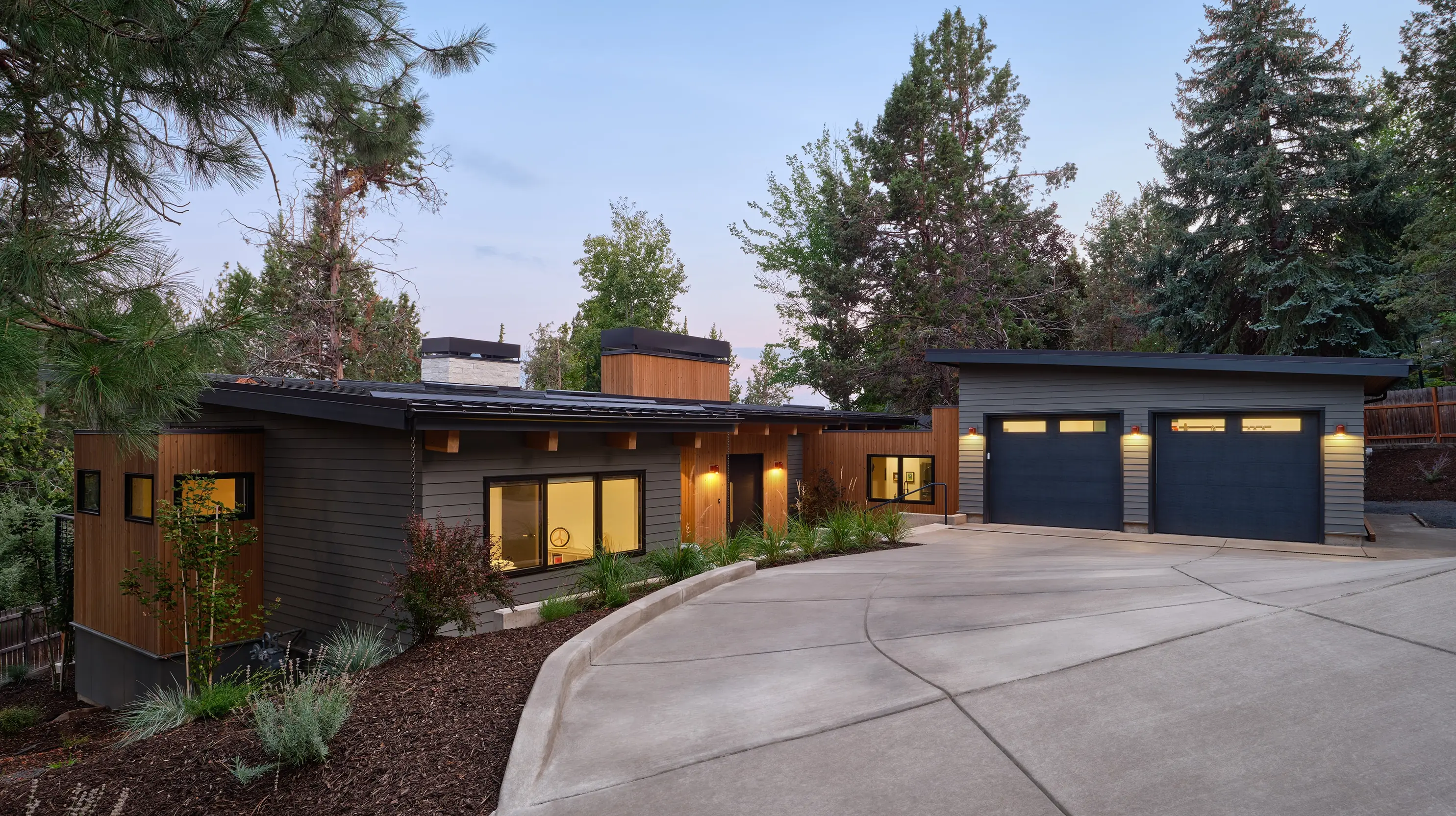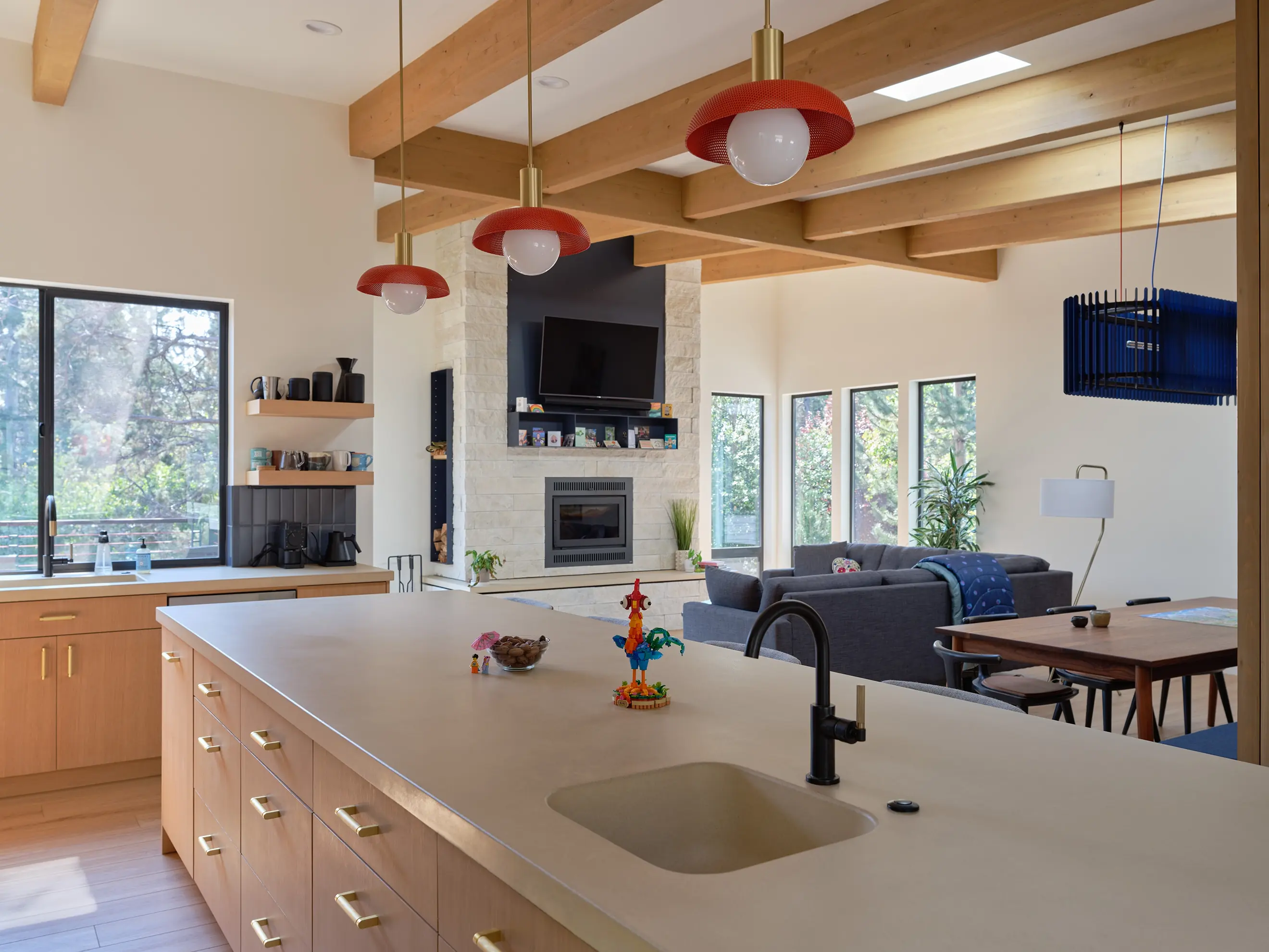 Glulam beams spaced to a four-foot module organize the structure and the plan. The living room cantilevers to the fireplace. The garage sits above the house. The roof, visible from the road, becomes a fifth elevation, all penetrations folded into a single chimney shroud so it reads clean from every angle. Two thousand square feet. Nothing wasted.